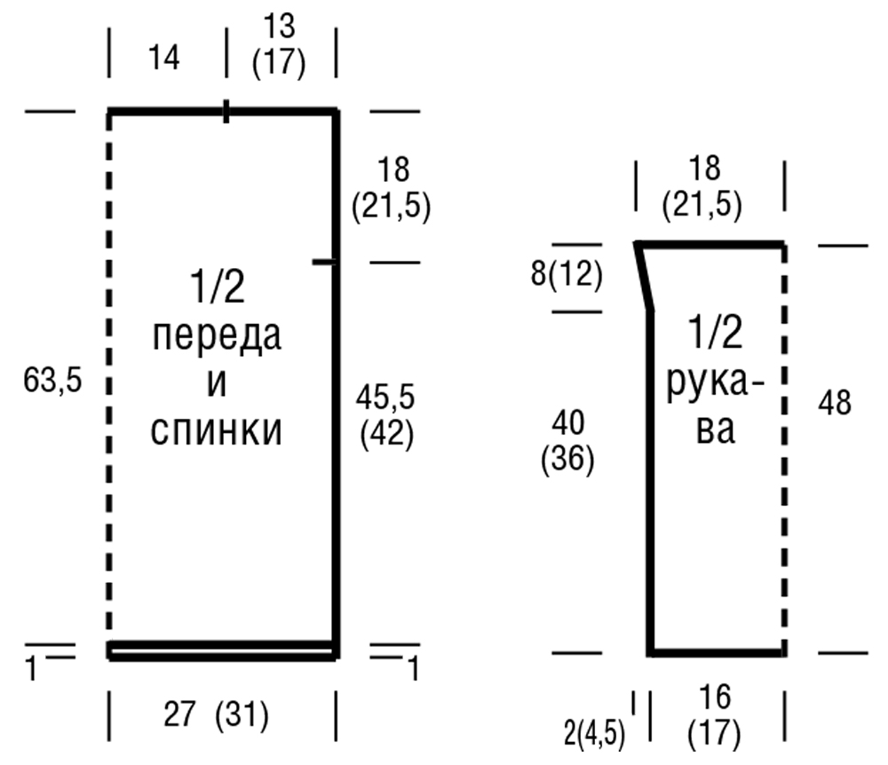 Средняя плотность вязания джемпера: 16 петель на 25,5 рядов соответствует 10 на 10 см.