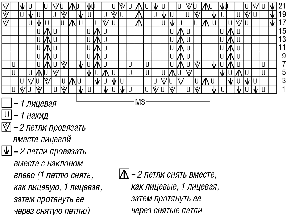 Узор 3: ажурный узор (число петель кратно 16 + 1) = вязать по схеме. На ней даны лицевые ряды. В изнаночных рядах все петли и накиды провязывать изнаночными. Начать с петель перед раппортом, раппорт постоянно повторять, закончить петлями после раппорта. Выполнить 1 раз 1-22-й ряды, затем постоянно повторять 3-22-й ряды.