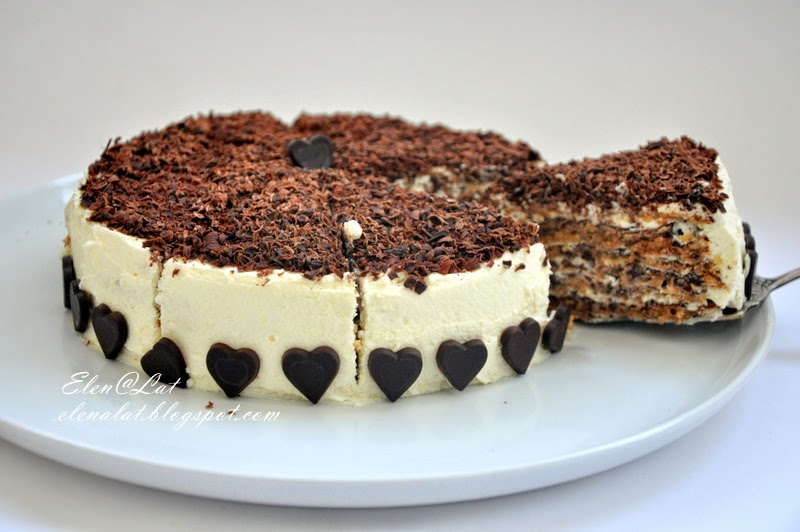Торт весь обмазать взбитыми сливками без шоколада. Сверху обсыпать торт крупно натертым темным шоколадом. Поставить в холодильник. Дать постоять пару часов и все, можно звать всех к столу. Необычайно вкусно!!!