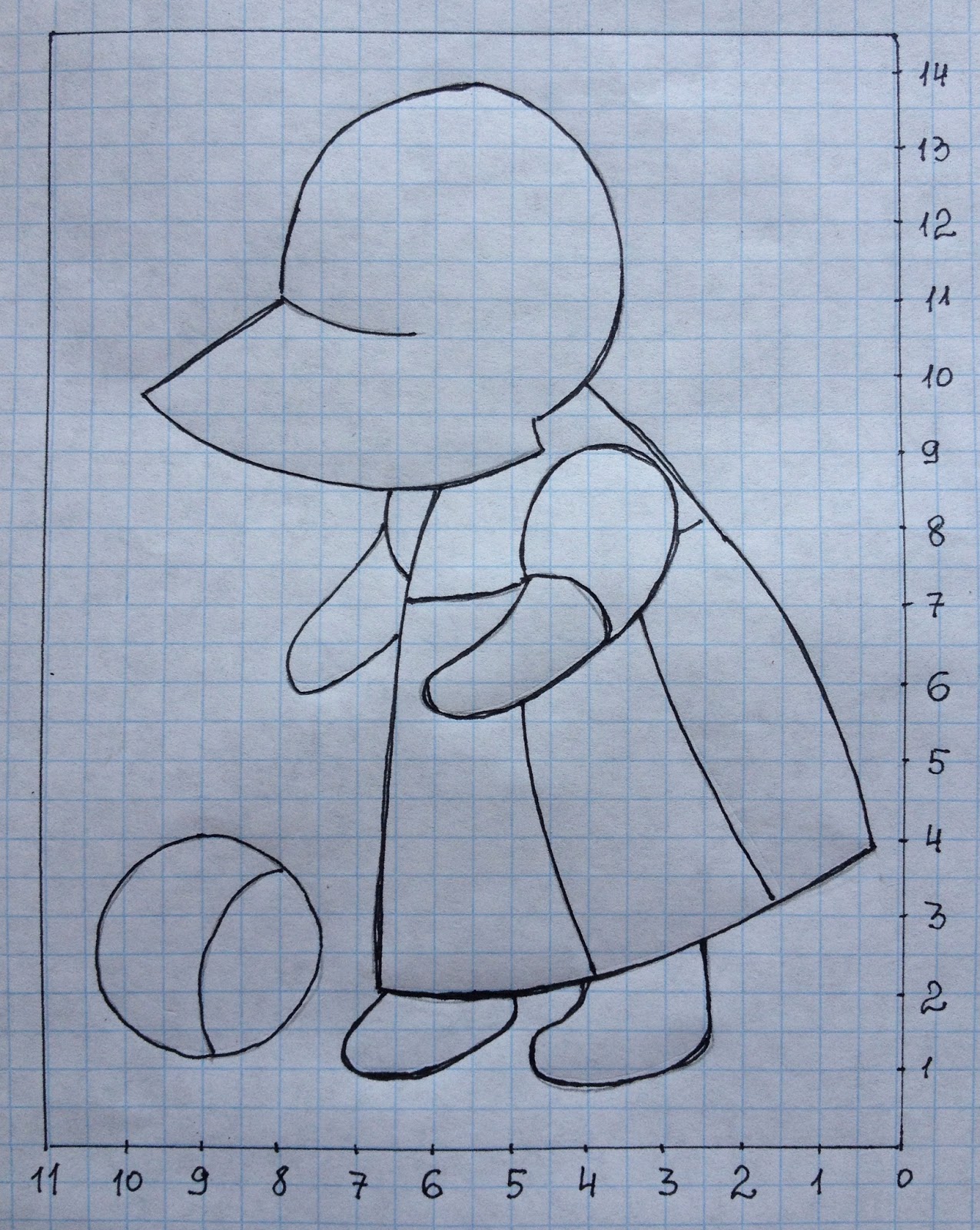 Удлиняем эти детальки с той стороны, где она покрывается следующей по счету. Например, ручка прячется под рукавчиком; со стороны рукавчика ее удлиняем и рисуем дополнительно 4-5 мм. Клин платья 5 прячется за клином платья 6 и т. д.