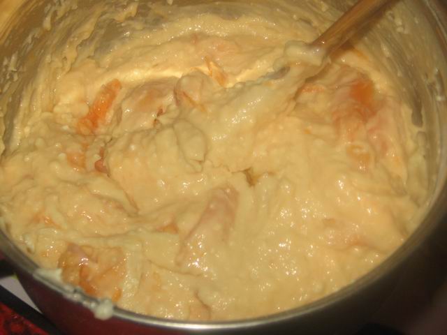 Аккуратно перемешаем. Готовое тесто выеладываем в кастрюлю мультиварки, разравниваем.