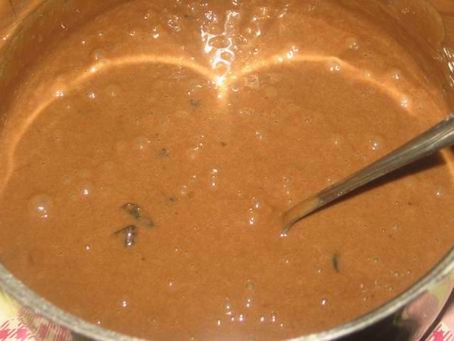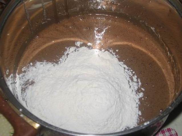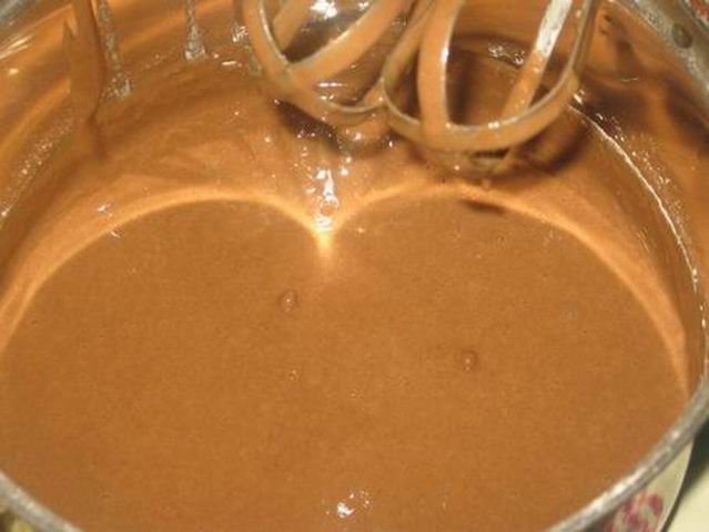 Заливаем его приготовленной глазурью: 10 гр сметаны нагреваем, добавляем 3 столовые ложки какао и 2 столовые ложки сахара. Доводим до кипения, помешивая, кипятим 1-2 минуты.
