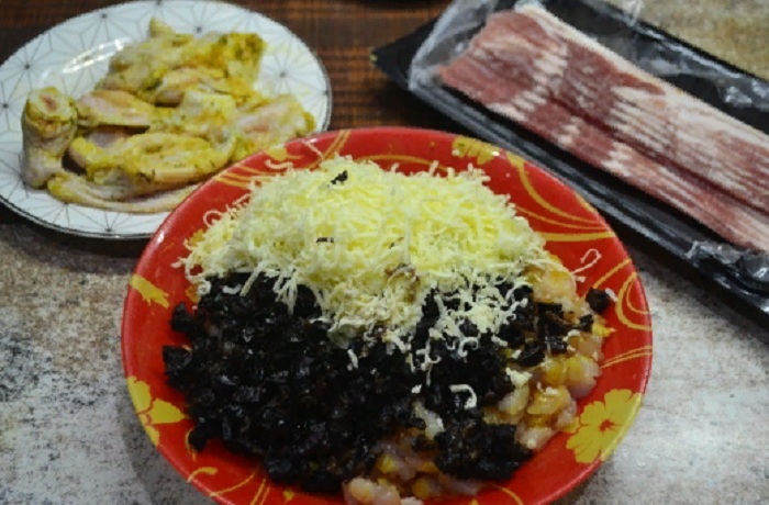 2 куриные грудки (небольшого размера); упаковку бекона, нарезанного длинными и тонкими полосками; 150 г сыра (он должен быть твердым и несоленым); куриную кожу, снятую с двух окорочков (лучше изначально брать крупные ножки); специи; соль; стакан чернослива.