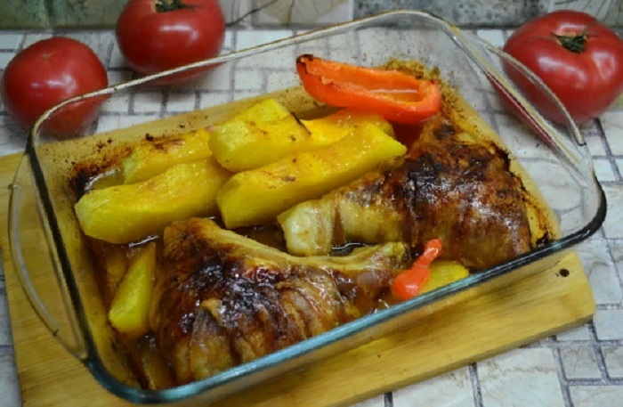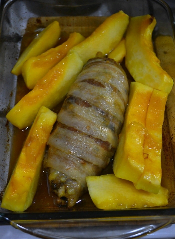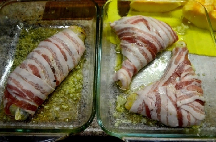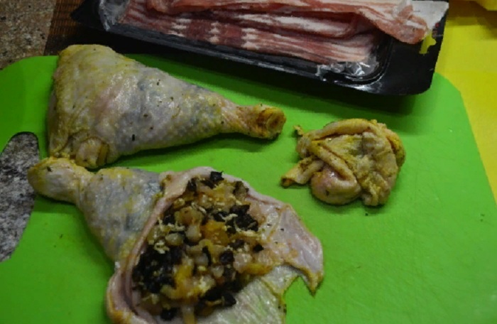 Каждую начиненную ножку следует плотно обернуть полосками бекона так, чтобы не было зазоров. Подготовленные рулеты следует сложить в противень и, накрыв их фольгой, отправить в духовку для запекания на полчаса.
