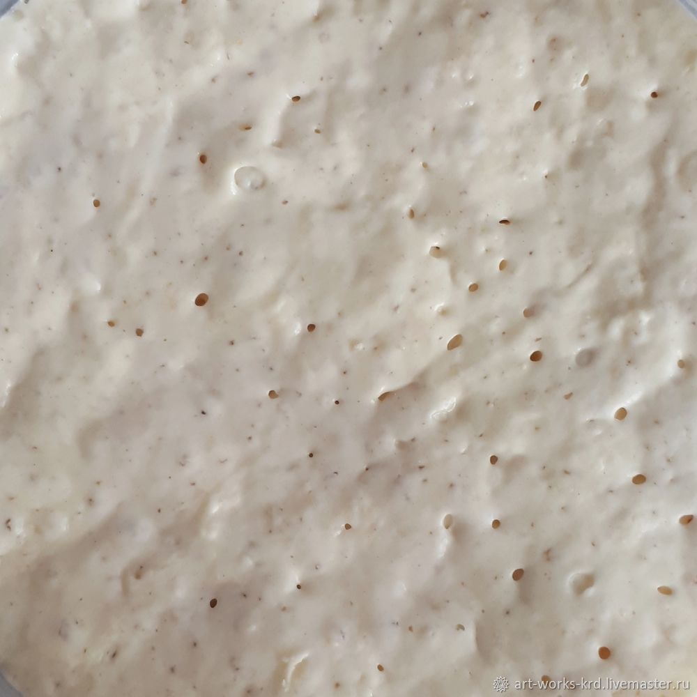 Готовая опара выглядит так. Пышная и вся пронизана пузырями!