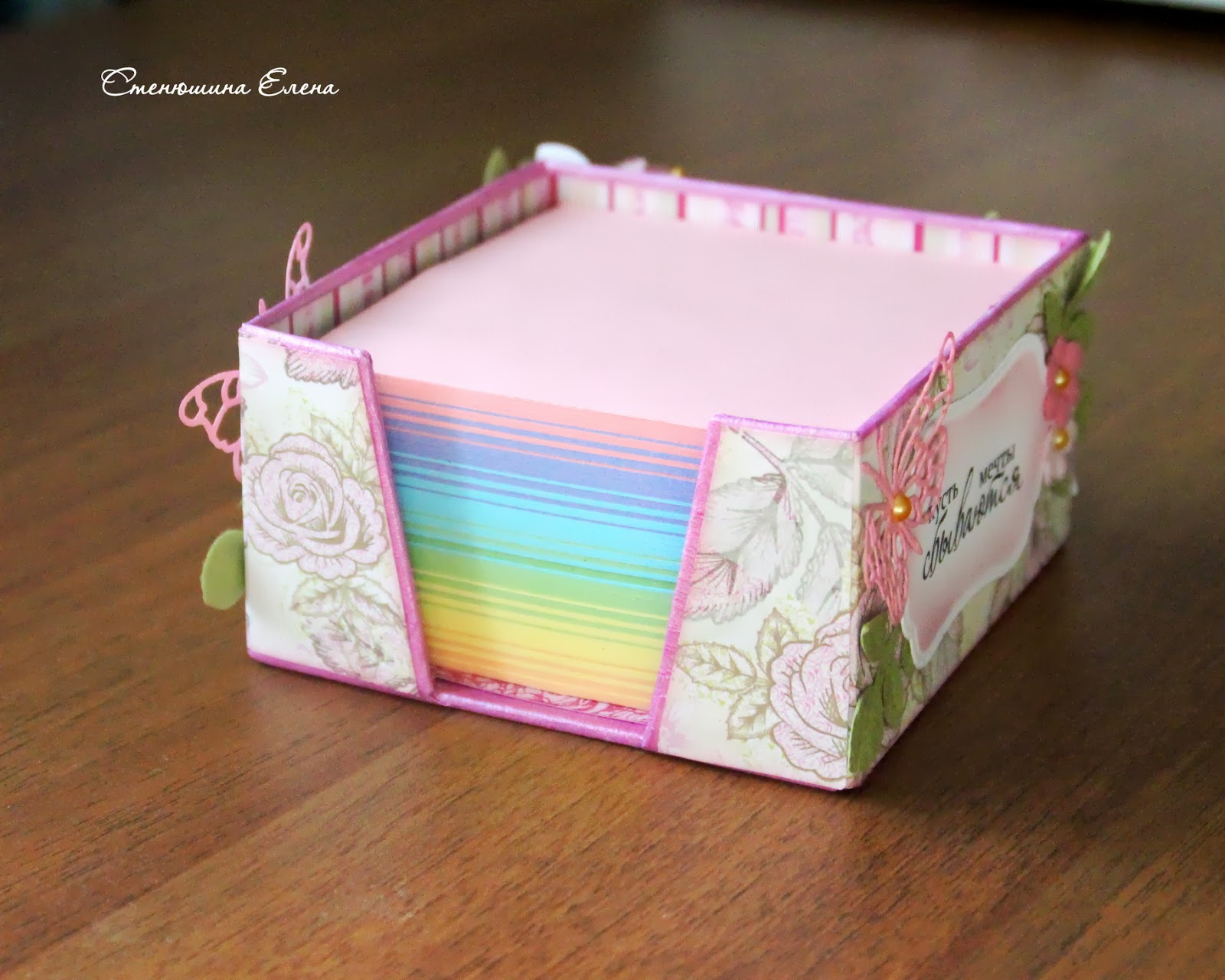 Идея сделать такую коробочку пришла ко мне в магазине, когда я увидела этот веселенький радужный блок для записей)))