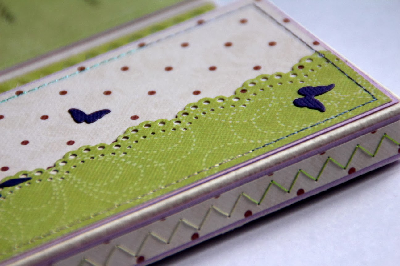 Все просто: картон, скрап-бумага, вырубка, декоративная строчка. Для отстрочки использовала шелковый нитки с переходом цвета. На следующей фотографии виден результат: