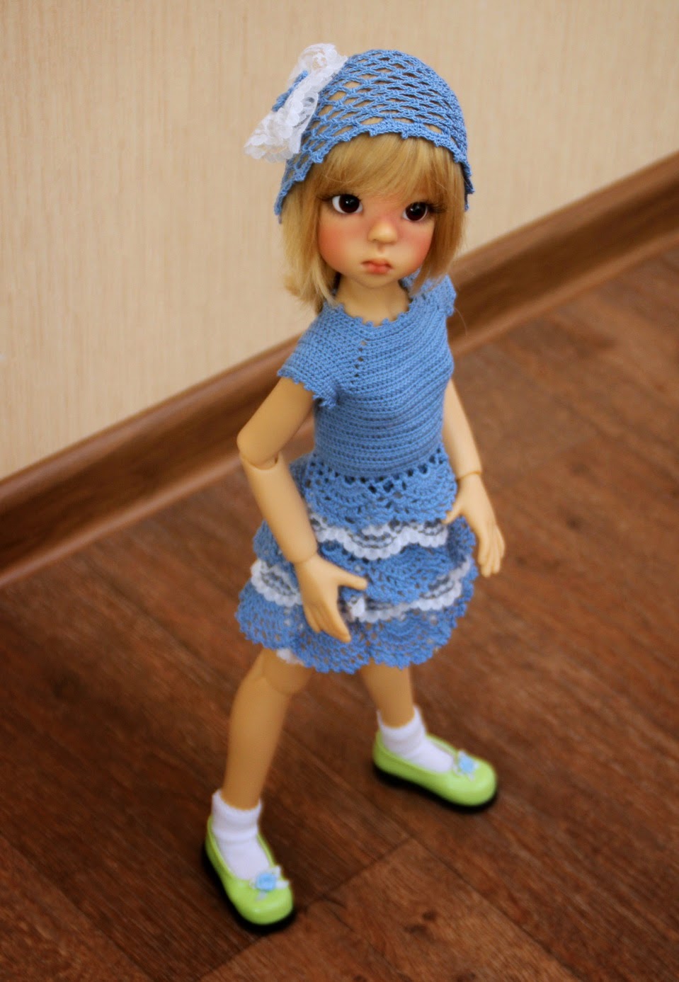 Пытаемся найти новый образ. Я связала ей платье и шапочку, сшила носочки, сменила паричок на короткий и более светлый. Вот, что получилось: