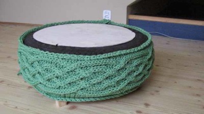 Вяжем боковую поверхность для нашего пуфика. Если не умеете или не хотите вязать, то для этих целей можно использовать части старого свитера.