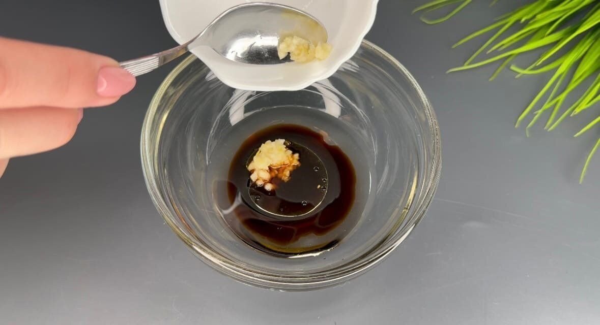 7. А теперь приготовим вкусную заправку для салата. Для этого смешиваем 2 ст. ложки растительного масла,1 ст. ложку соевого соуса, 1 ч. ложку мёда, 2 ч. ложки лимонного сока и 2 зубчика чеснока. Всё тщательно перемешиваем и заправляем салат.