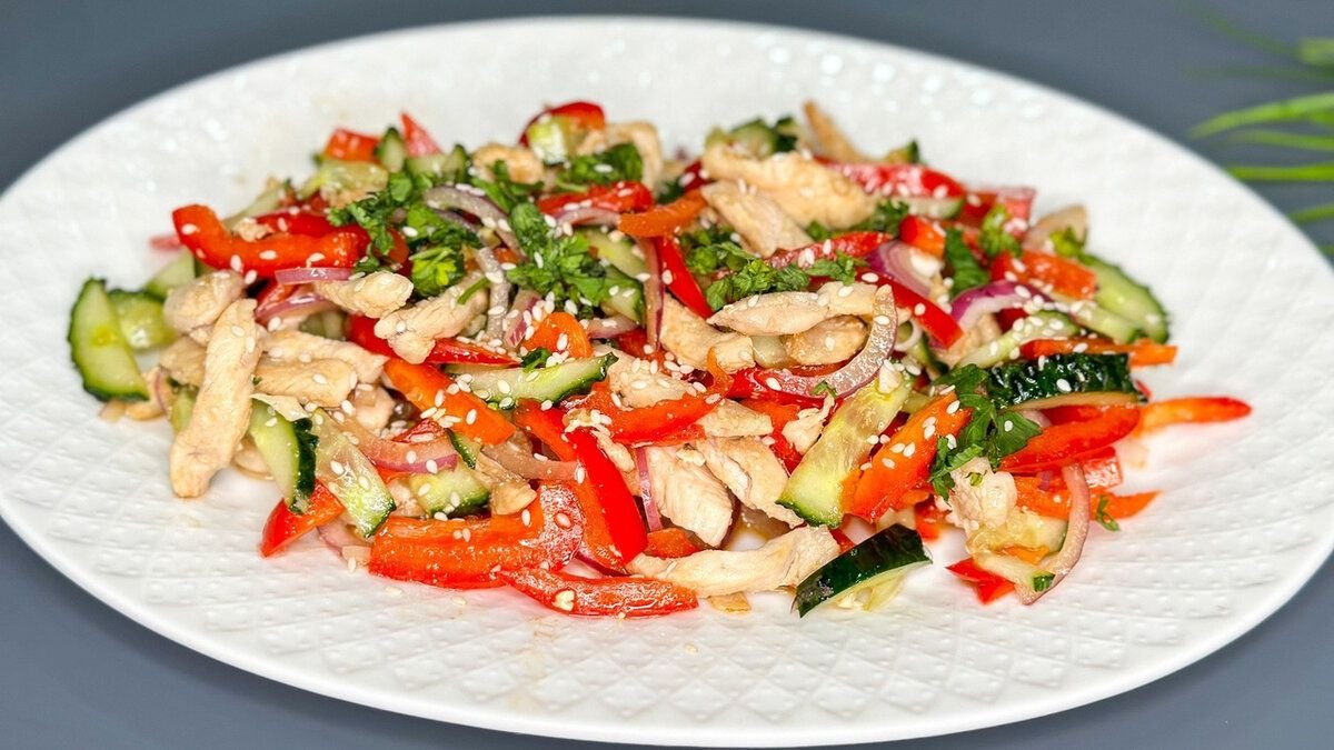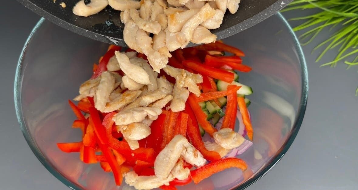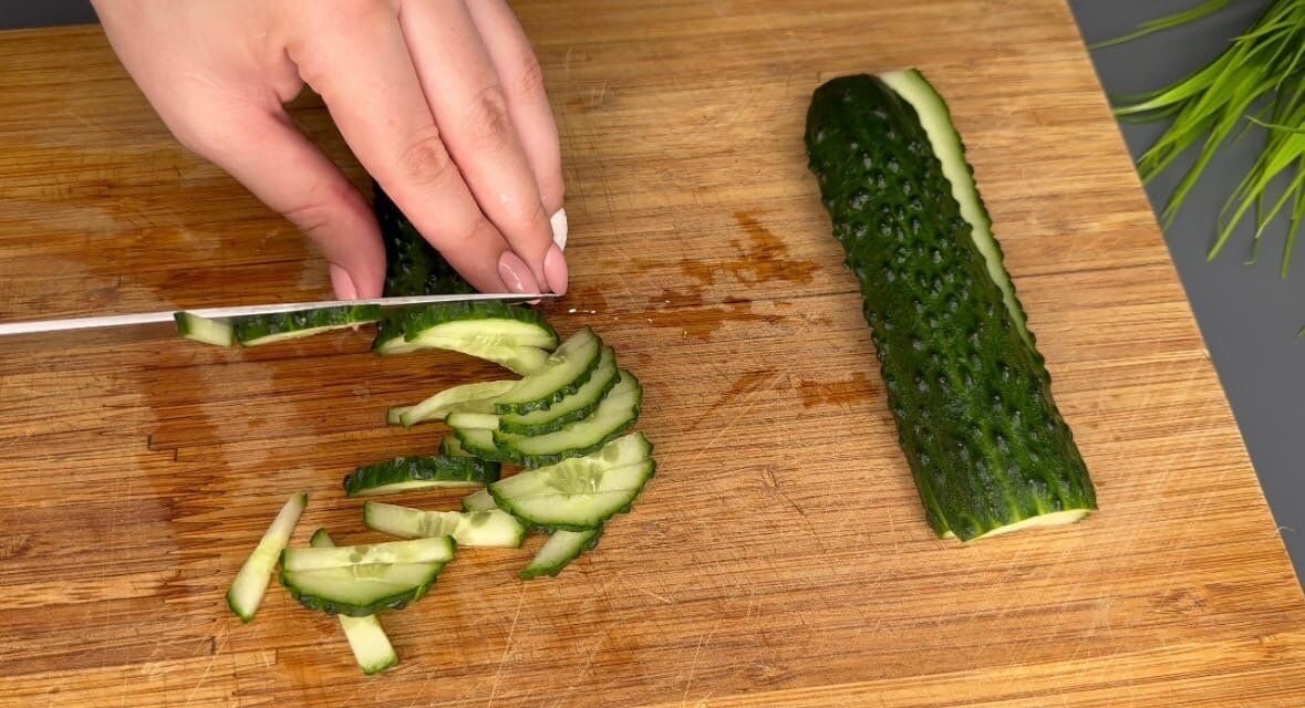 5. Сладкий болгарский перец нарезаем так же как и огурец.6. Смешиваем все подготовленные ингредиенты.