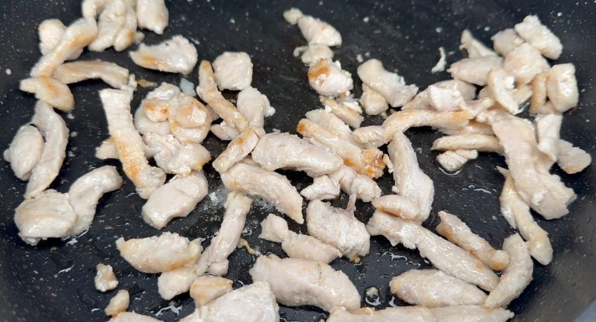 1. Куриное филе разрезаем пополам и нарезаем длинными полосками.