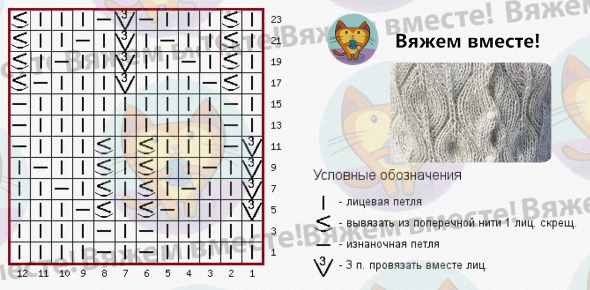 Рапорт составляет 12 петель по ширине и 24 ряда по высоте. Чётные ряды вяжутся по рисунку петель на спице.