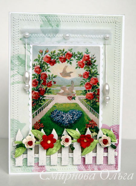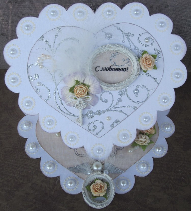 Такую открытку можно подарить на свадьбу, но и как валентинку, думаю, тоже. Она пока у меня "безымянная", а надпись на предыдущих фото наштампована чёрным стазоном на кусочке подложки от штампов и вставлена в рамочку (рамочка приподнята над открыткой, приклеена на кусочки картона).