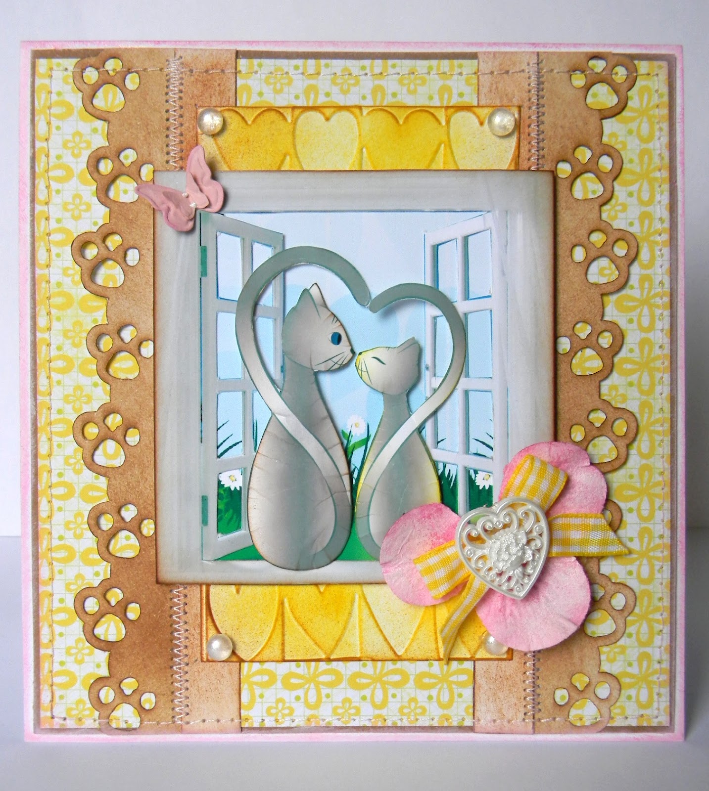 Котики посажены на объемный скотч, окошко вырезано и наложено на фон с травкой)
