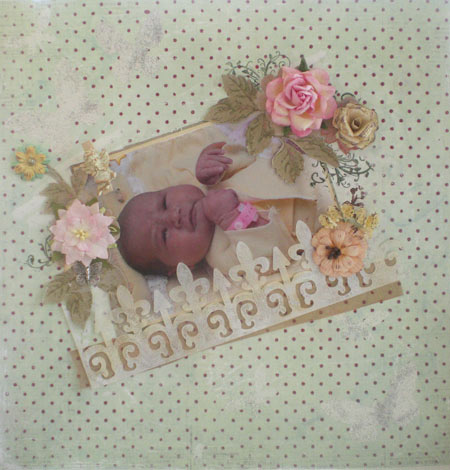 Бумага снаружи DCWV Nana's Nursery Baby Girl Premium stack, внутри Melissa Frances "Attic Treasures" - Alma. Цветы Prima, розочки Thailand, половинки жемчужин TGC, текстильный карманчик с тегом, листики с ленты May Arts, бабочки - дырокол Maped, машинная строчка, текстильное кружево, вощеный шнур, пуговка Dress It Up, бусинки.