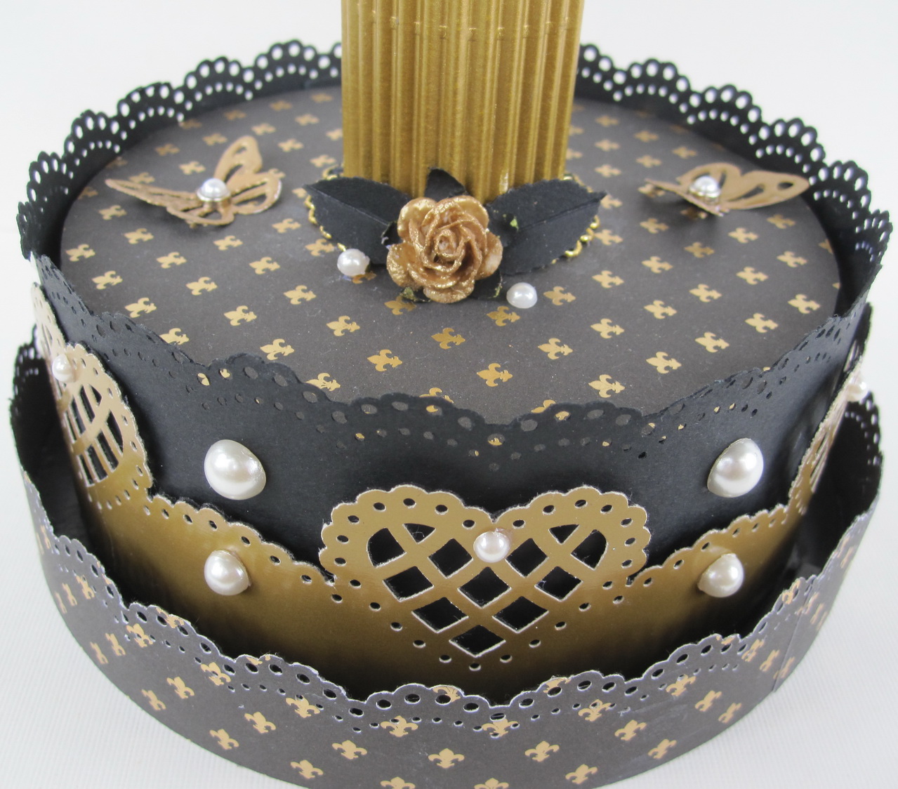 По материалам: бумага для пастели, золотой дизайнерский картон и гофрокартон, лист бумаги из набора DCWV Mariposa 30x30 см, чёрная бумага из альбома для рисования (для обратной стороны дырокольных элементов), круги для крышки шкатулки и основания купола вырезаны из упаковочного гофрокартона; кремовые половинки жемчужин Melissa Frances и Thailand, дыроколы MS Lattice heart, Doily Lace Edge Craft Punch, Monarch butterfly large, Rose leaf, круговой дырокол Fiskars.