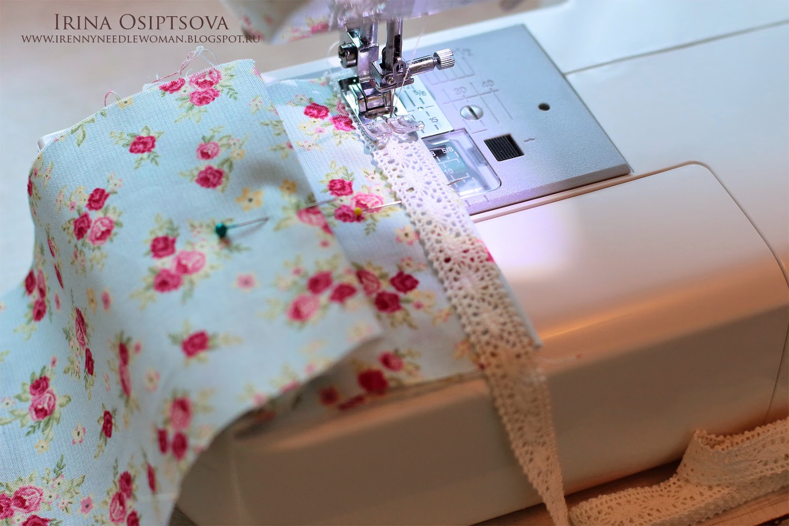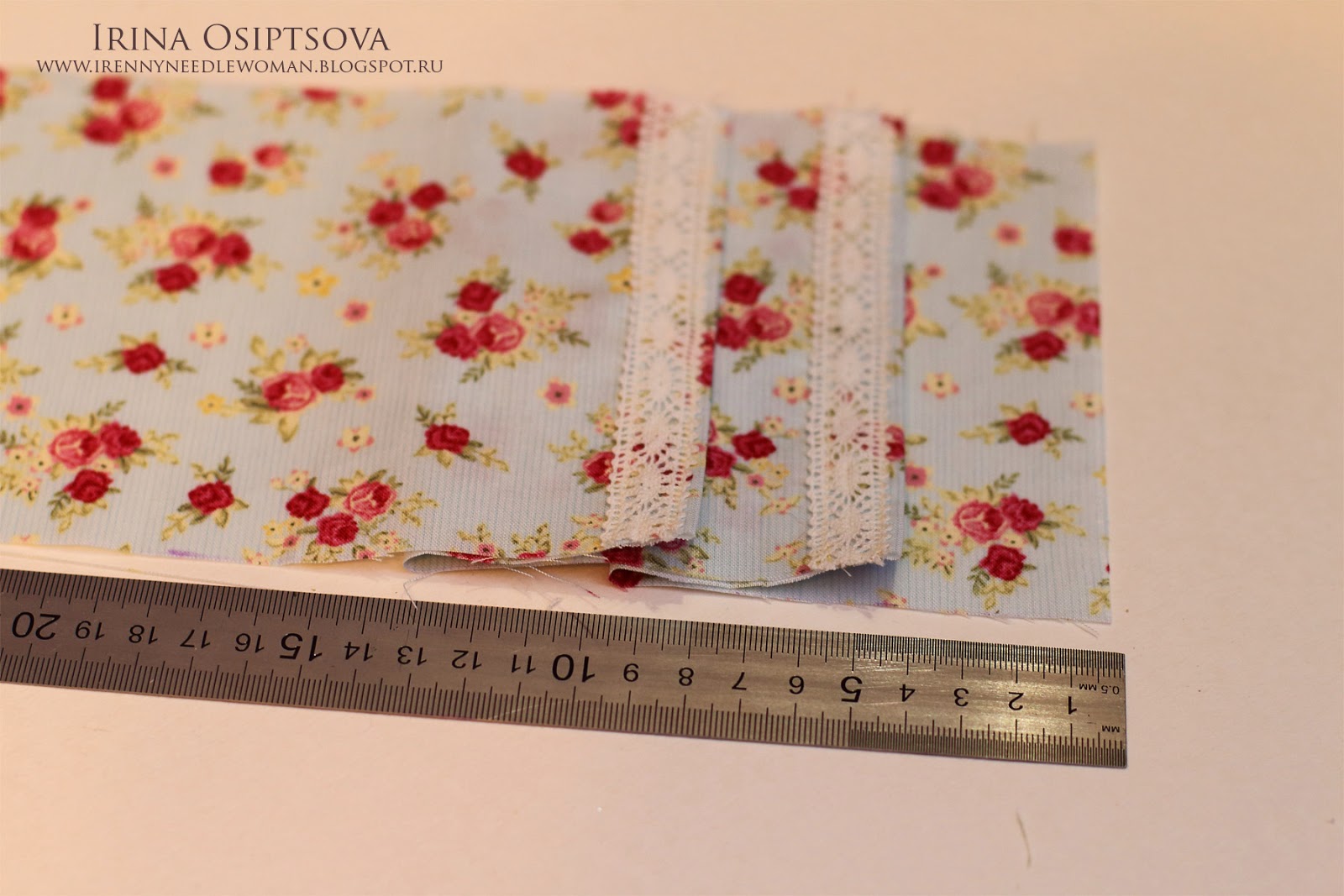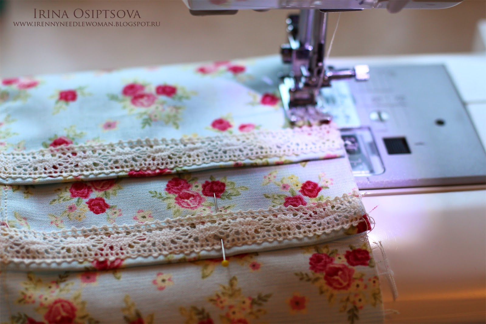 10. Делаем отстрочку по краю вместе с кружевом. Таким образом пришиваем кружево с двух сторон.