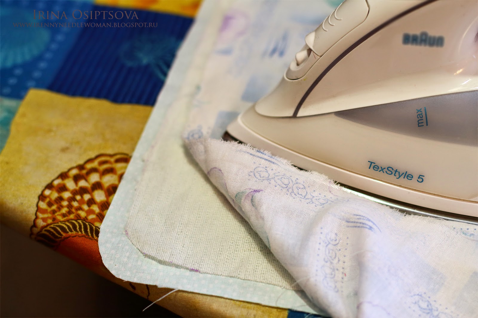 14. Разворачиваем наш подготовленный лоскут и уплотняем лоскутом жесткого дублерина с помощью утюга и проутюжки.