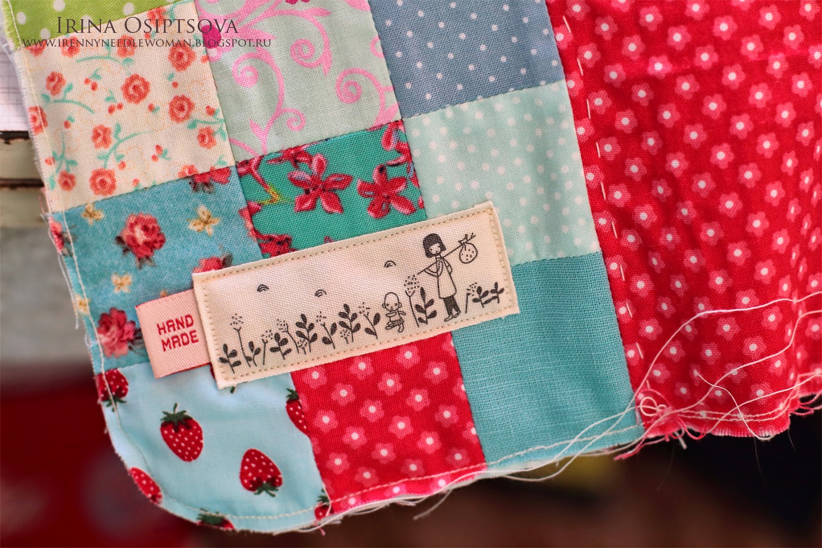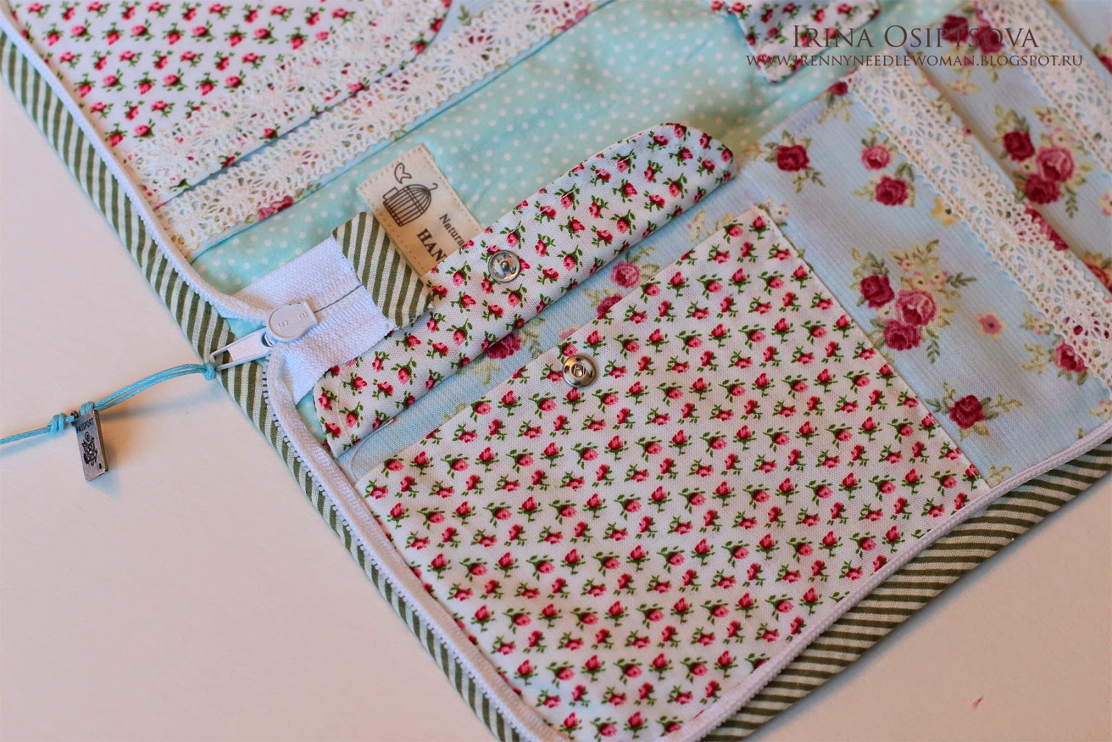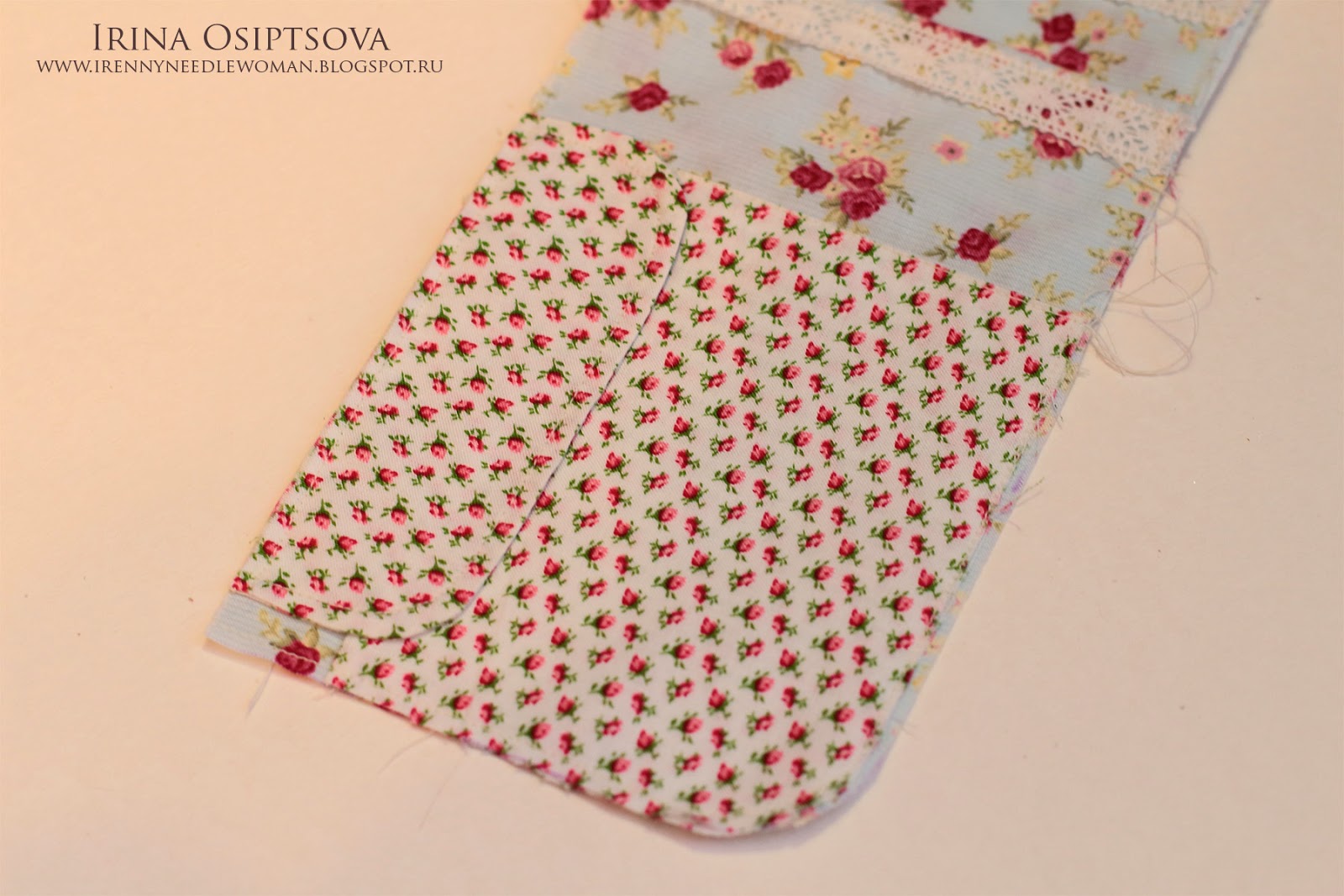 4. Украшаем нашу лицевую часть. Я простегала ее вручную и пришила этикетки и кусочек кружева.