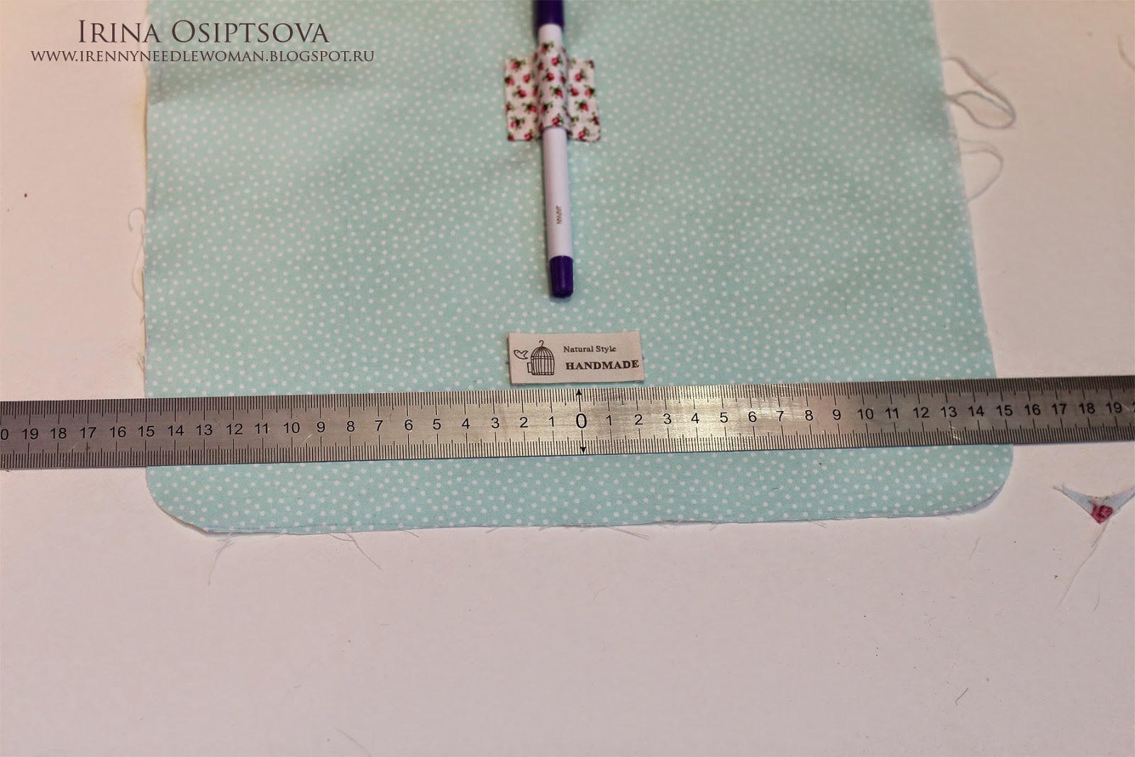 43. Теперь, по центру нижней части основной детали пришиваем этикетку.