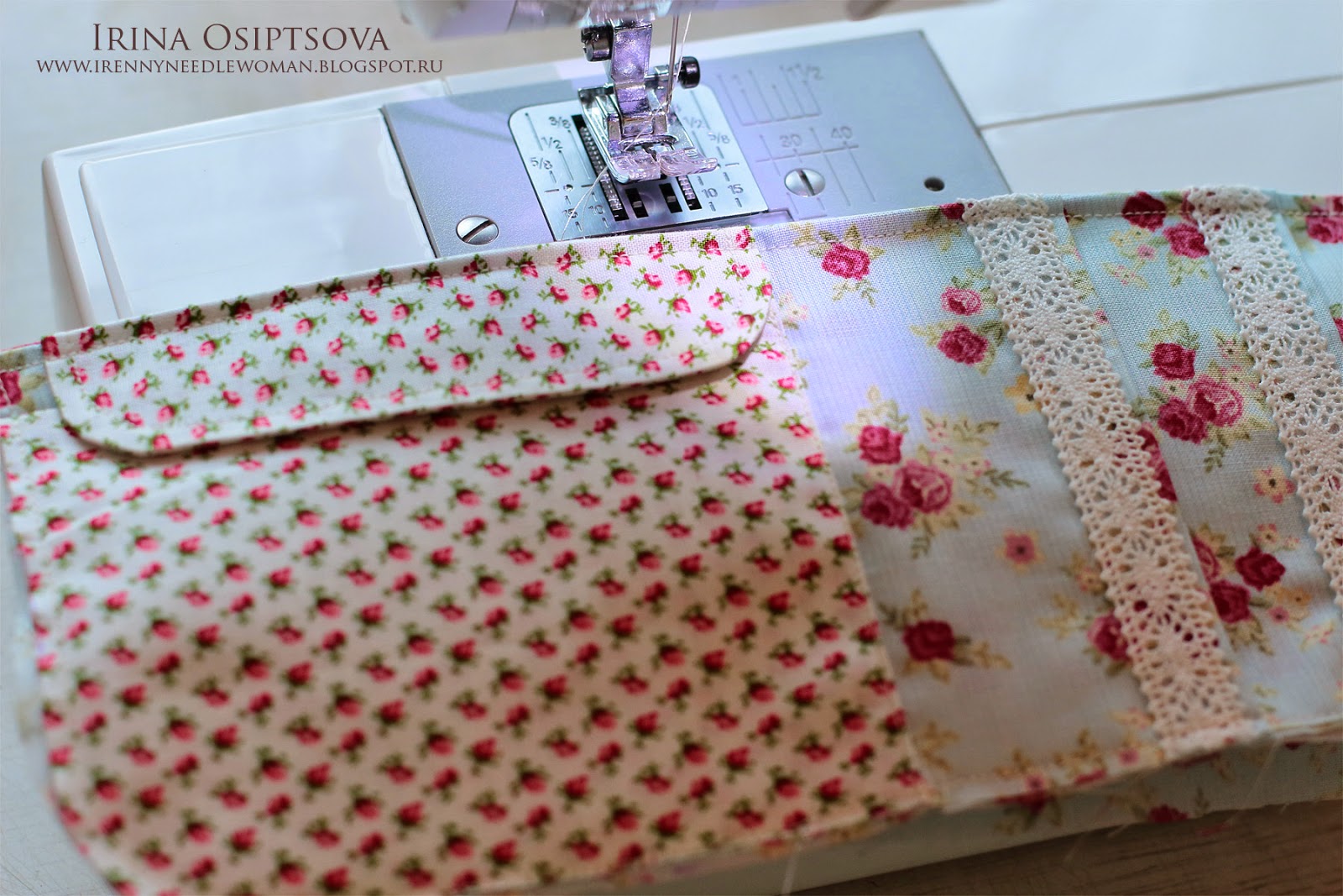 22. Делаем отстрочку по краю кармашков с помощью кружева.
