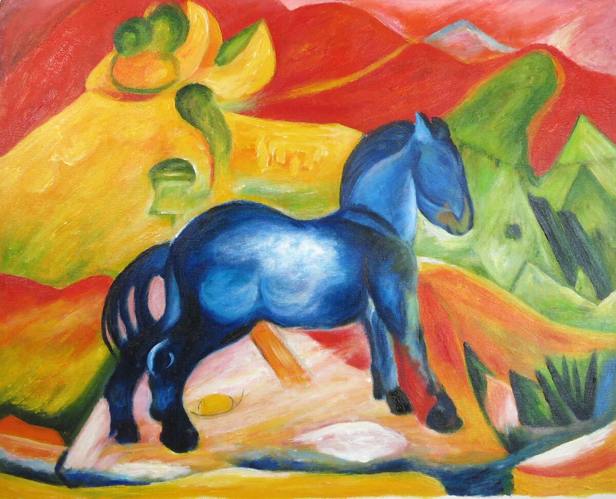 В картине «Синий конь» наблюдается значительное преобладание синего цвета. Здесь художник соединил благородное животное и синий принцип, создав нечто неотразимое. Тем не менее, этот образ настолько неотразим не только из-за цвета. Сама форма лошади также довольно экспрессионистична, то есть, она вызывает различные эмоции в душе каждого человека. Благодаря тому, что голова животного склонена, создается впечатление, что лошадь — это восприимчивое существо, которое тоже способно чувствовать.