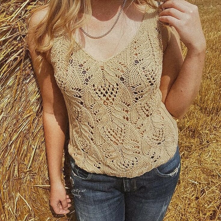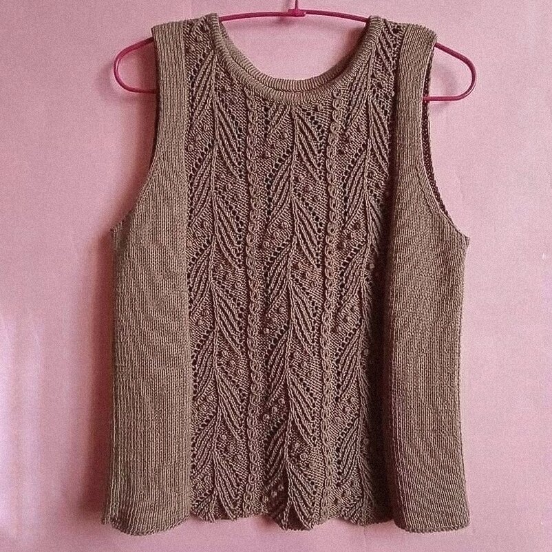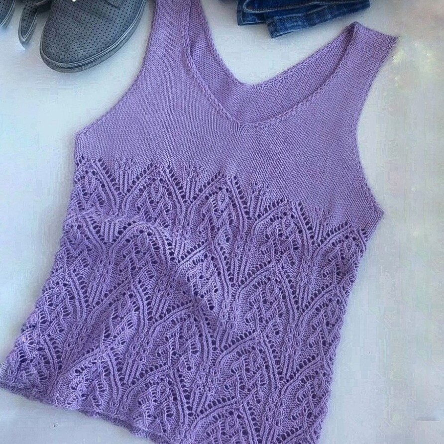 Насколько мне удалось заметить, этот узор один из наиболее популярных среди тех узоров сборника, которые выбирают рукодельницы для вязания своих изделий. Модель самая банальная, топ-майка, на выходе получилась довольно привлекательная вещь.