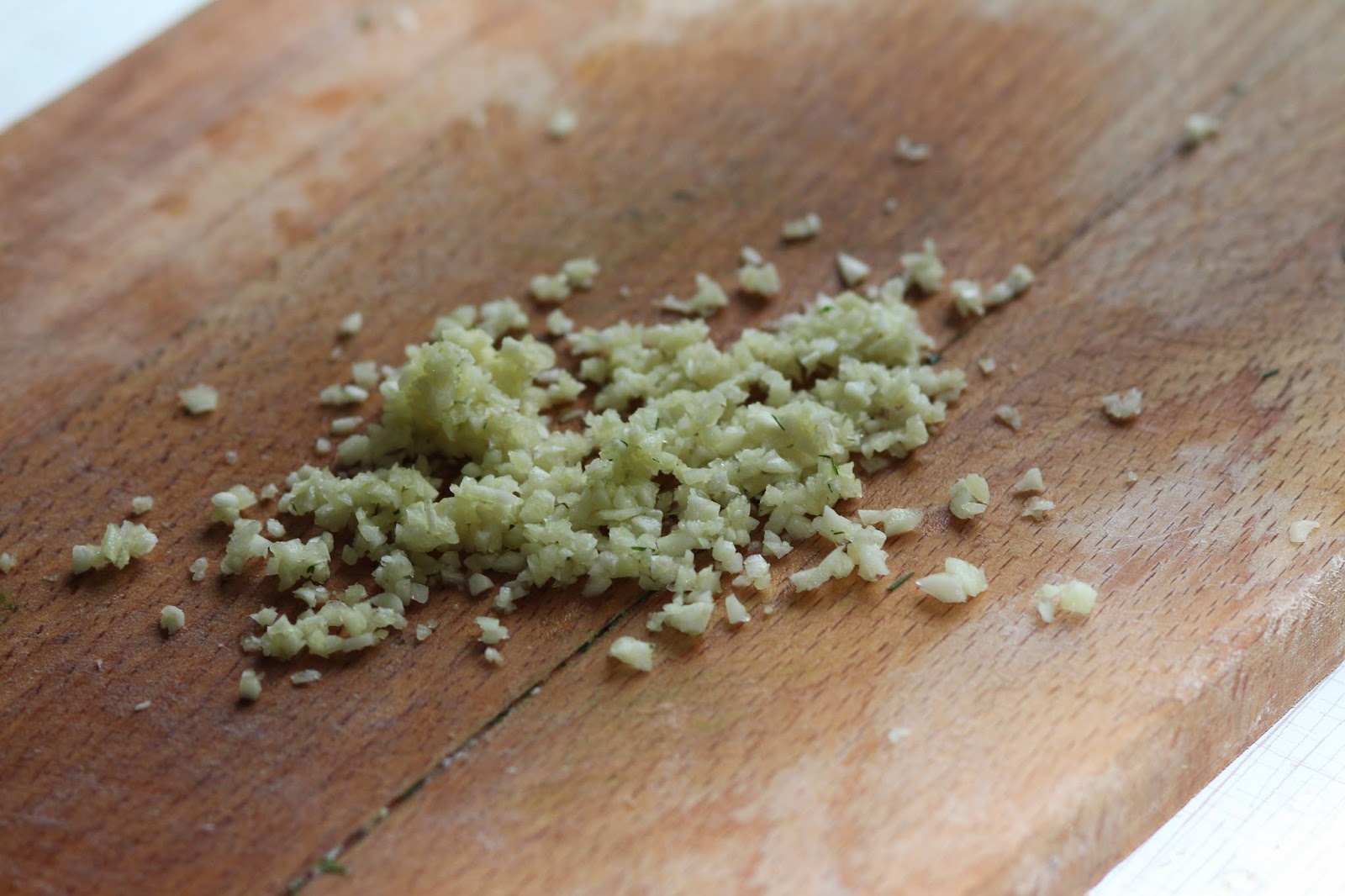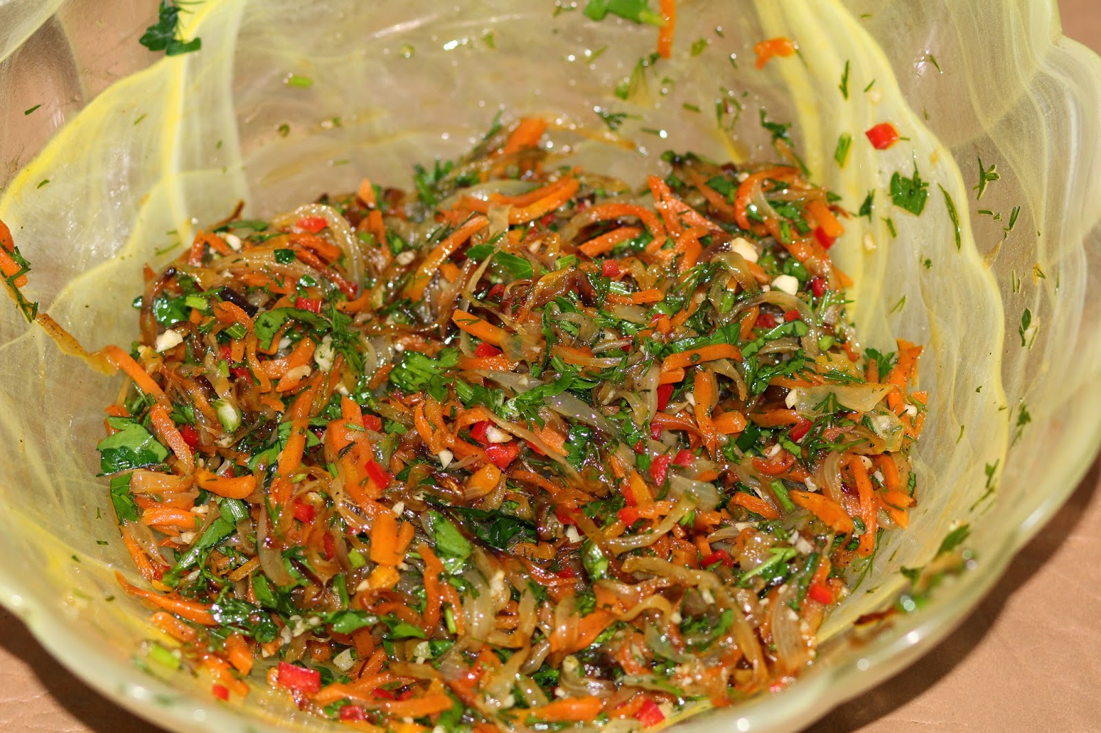 8. В миске смешать чеснок, лук с морковкой, укроп с петрушкой, перец острый соль и перец черный молотый.