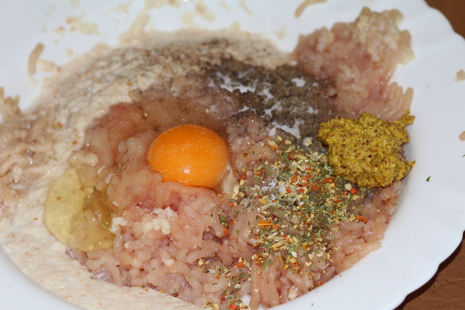 10. На мясорубке со средней решеткой прокрутить куриное филе, чеснок и хлеб. Добавить яйцо, горчицу, соль, перец черный молотый и приправу для курицы.