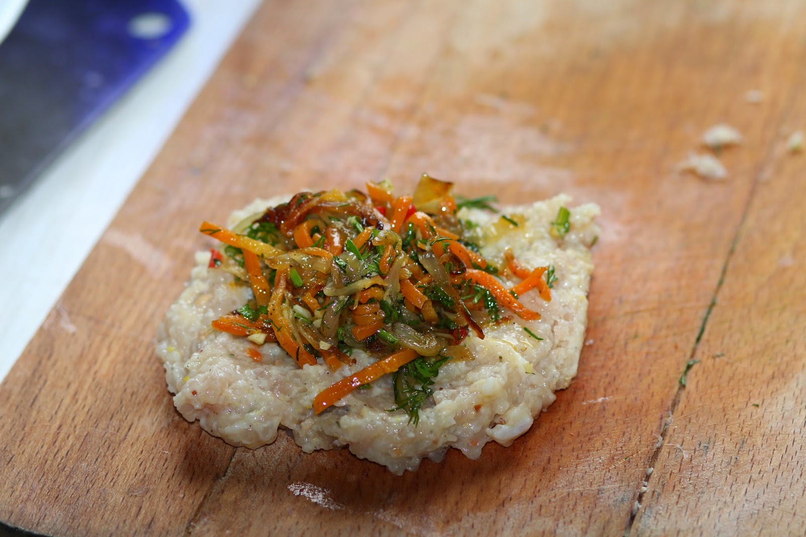 12. Мокрыми руками сформировать лепешечку из фарша. На середину лепешечки положить ложку начинки и сформировать зразы ( обязательно смотрим чтобы начинка была внутри зразы).