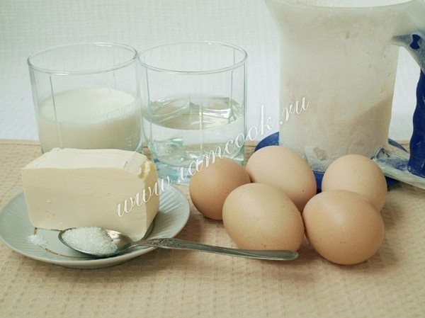 Для приготовления эклеров нам понадобятся молоко, вода, мука, сливочное масло, немного сахара и яйца. Яиц может быть 4 или 5, нужно смотреть по консистенции теста.
