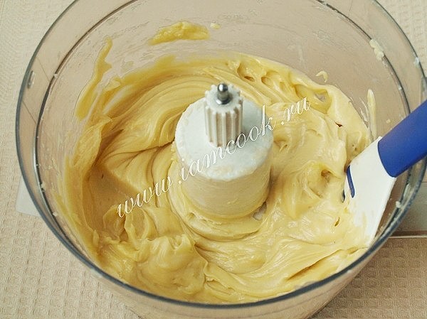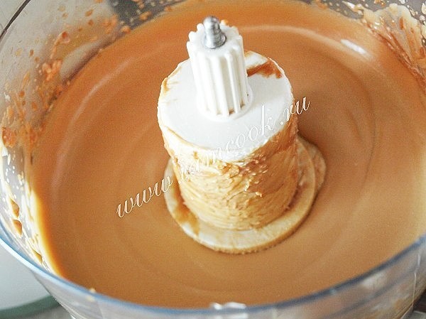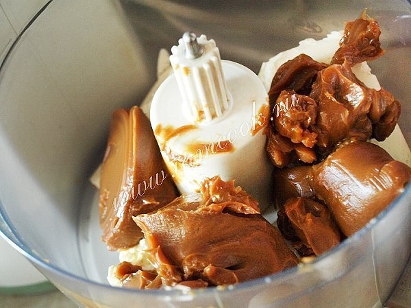 Чтобы крем получился однородным все продукты должны быть комнатной температуры. На медленной скорости в комбайне смешиваем масло и варёную сгущёнку.