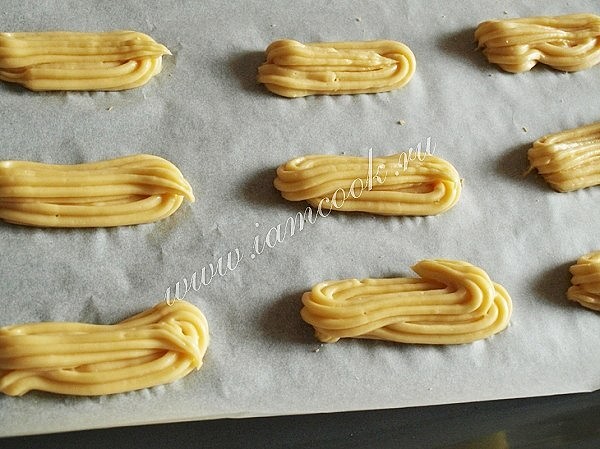 Тесто выкладываем в кондитерский мешок, застилаем противень бумагой для выпечки и выдавливаем тесто полосками. Ставим выпекаться в разогретую до 200 градусов духовку, печём 10 минут. Затем убавляем температуру на 175 градусов и печём ещё 10 минут.