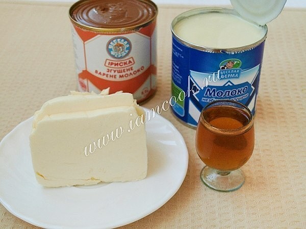 Для крема нам понадобится варёная сгущёнка, обычная сгущёнка, сливочное масло и коньяк.
