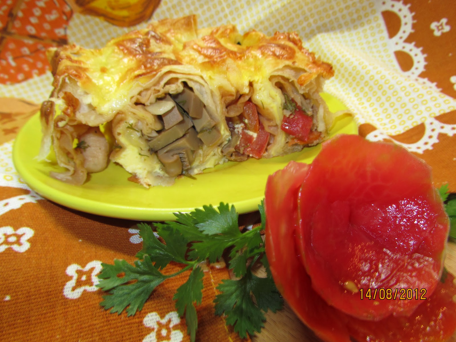 Для начала приготовим начинки, их будет две. Измельчить отварные грибы, смешать с порезанными помидорками, зеленью и измельченным чесноком. Подсолить и поперчить. В разогретой сковороде обжарить фарш с луком, морковь (потереть на терке), посолить, поперчить.Начинаем сборку пирога. Разъёмную форму смазать слив. маслом. Лист лаваша разрезать пополам, на 2 части. На край выложить фарш (половину), свернуть рулетом. Выложить рулет в форму кольцом, чередуя кольца с начинками.
