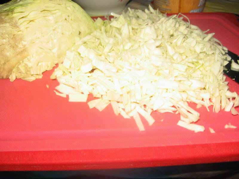 Капусту нашинковать потоньше. Добавить соль, слегка помять руками.