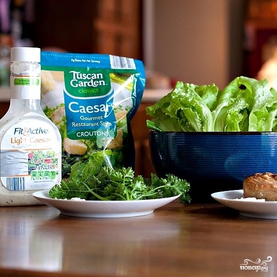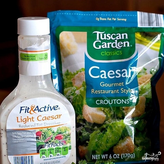 [показать] Итак, вот - все необходимые нам ингредиенты. Сразу сделаю оговорку: я использовал уже готовый соус Цезарь (мне привезли из Европы, что-то похожее продается и у нас), однако если у вас его нет - соус для цезаря можно приготовить и самому. На этом сайте есть рецепт.