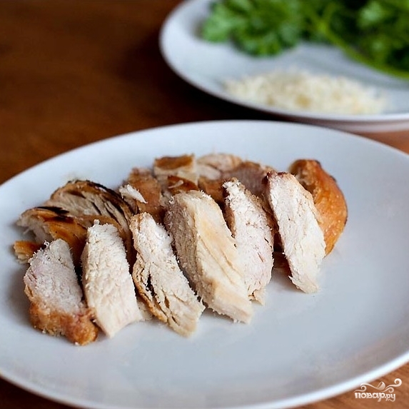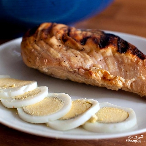[показать] Кусок куриного филе целиком необходимо обжарить на сковороде-гриль, ну или на обычной сковороде. Примерно по 3-4 минуты с каждой стороны, до образования уверенной корочки. Внутри мясо должно оставаться сочным. Яйца отвариваем вкрутую и нарезаем слайсами.