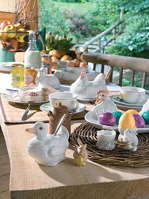 3. Есть тоже такая идея(особенно подходит для тех, у кого имеется балкон или сад, и вам тут можно даже не использовать скатерть, достатоно просто небольшого уютного для пикника столика из дерева) украсить стол посудой в форме курочек, цыплят, кроликов, а также с узорами таковых. Наприме мисочка, в которой у вас буду лежать яйца, может быть в виде курочки, а на всех тарелках тоже буду узображены курочки.