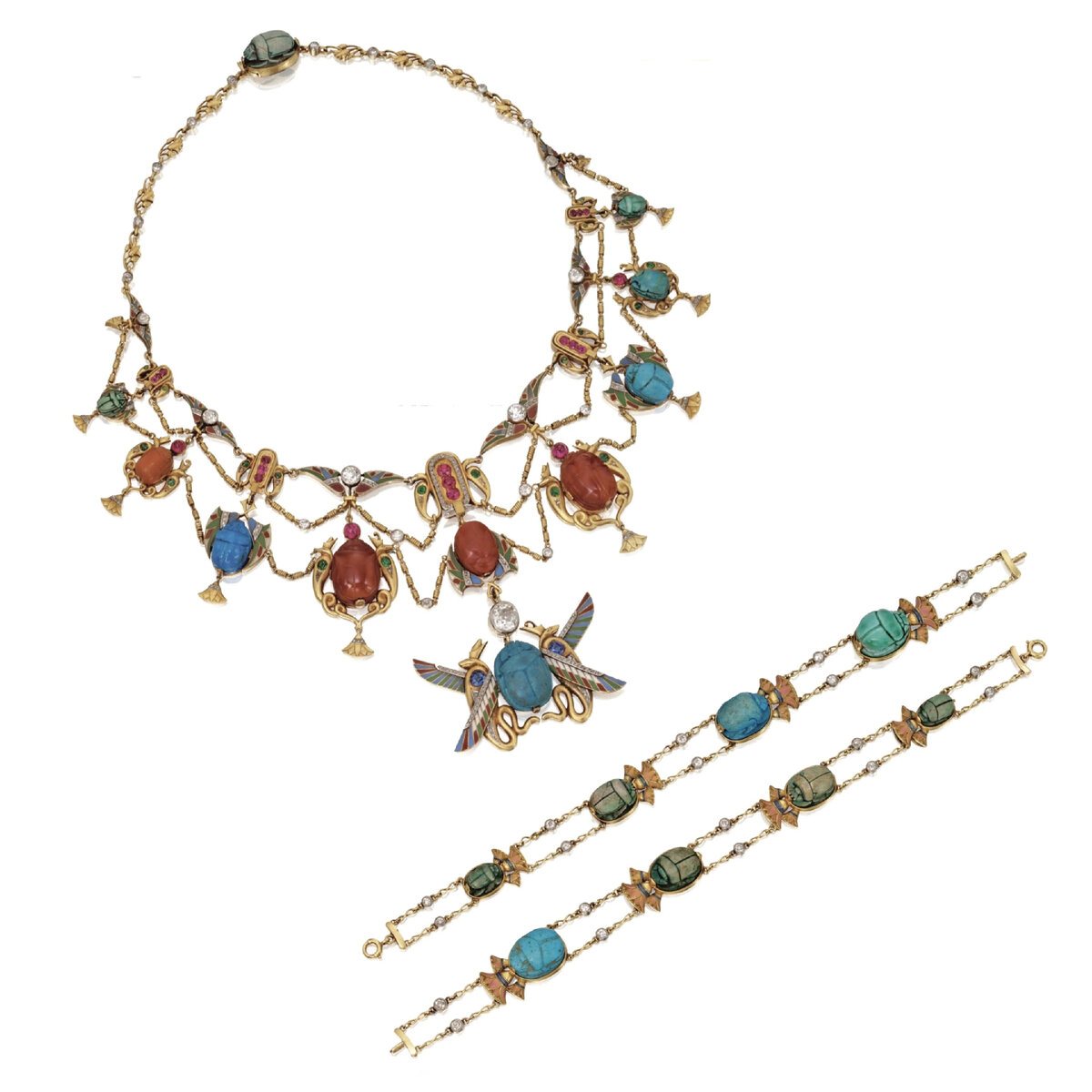Ожерелье и пара браслетов из золота, платины и драгоценных камней в стиле "Египетского возрождения". Начало XX века