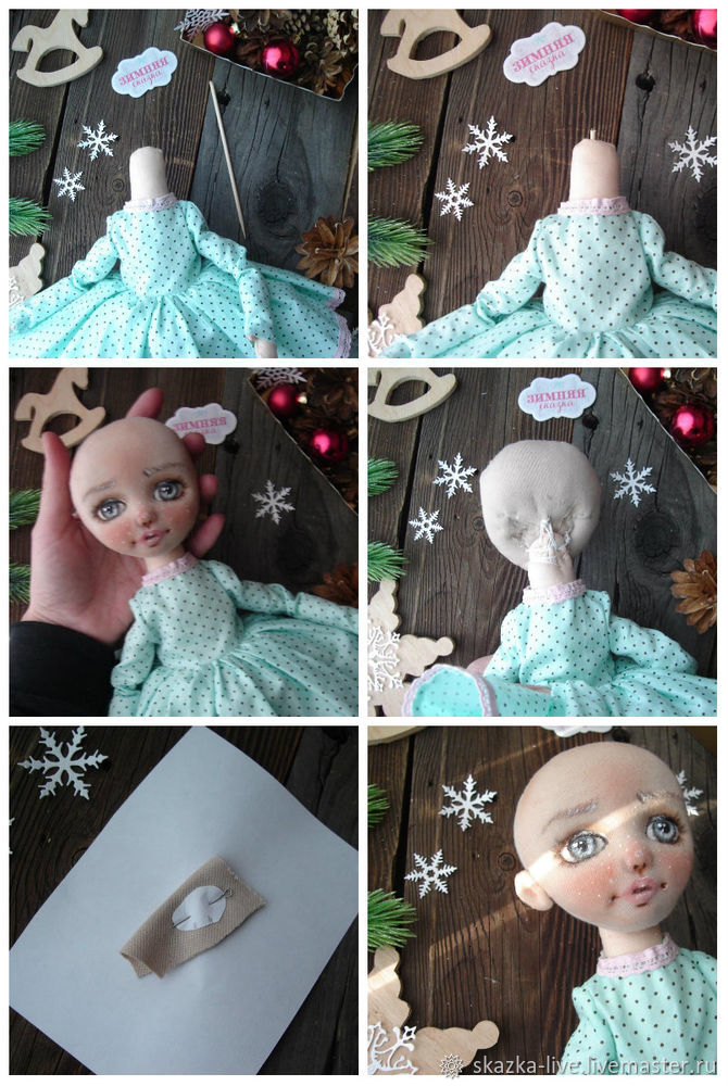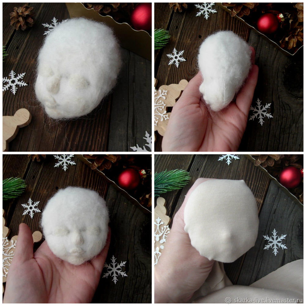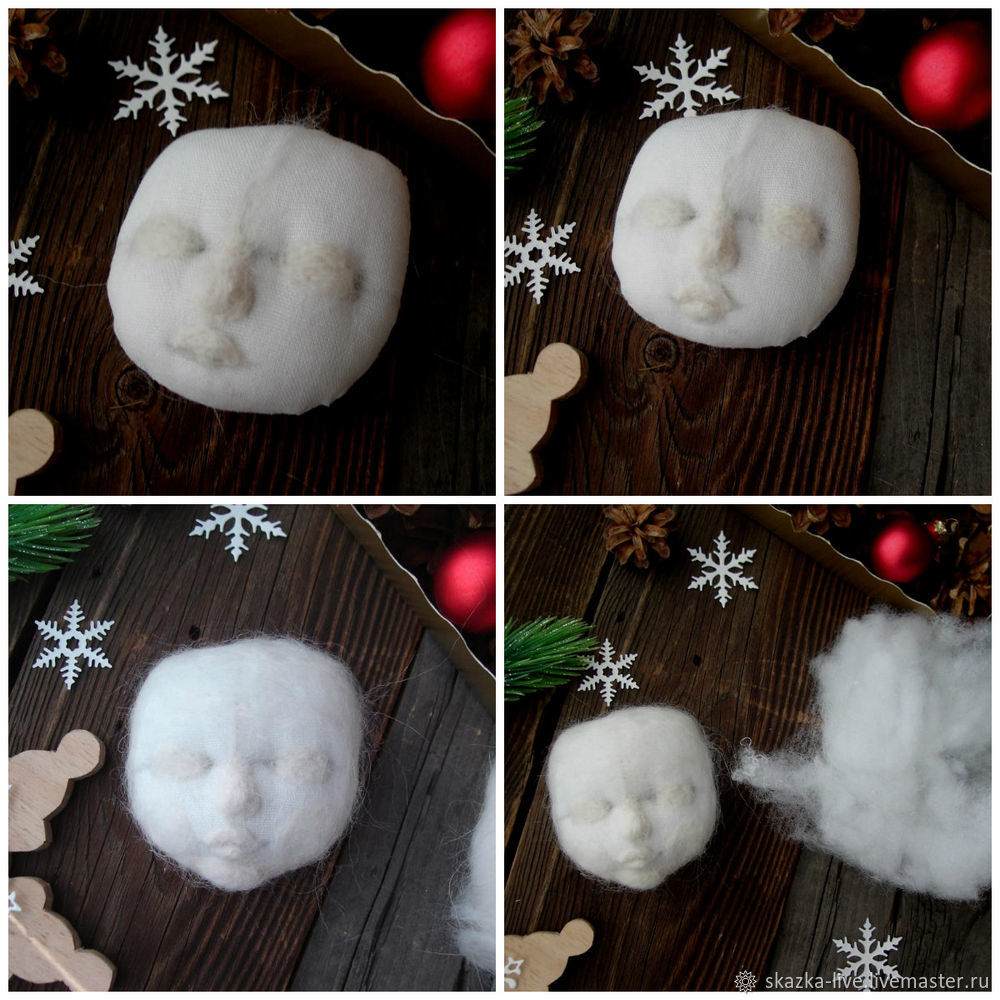 Синтепухом мы приваливаем лоб и затылок, следя за тем, чтобы глаза были по центру личика.