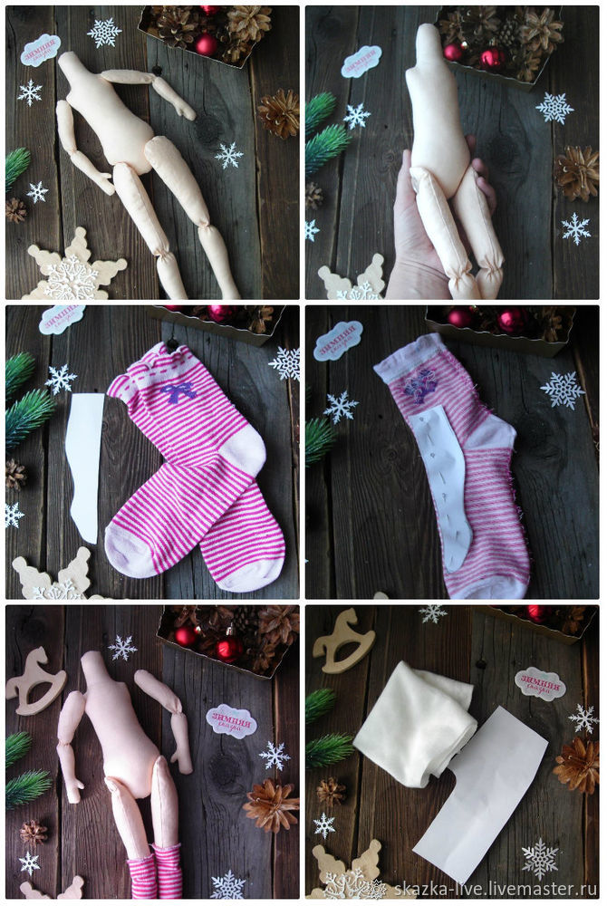 Беремся за чулочки — для этого нужны носочки в полосу (ну очень полосатые чулочки люблю). Прикладываем выкройку и прошиваем. Выворачиваем, надеваем на ножки куколки.