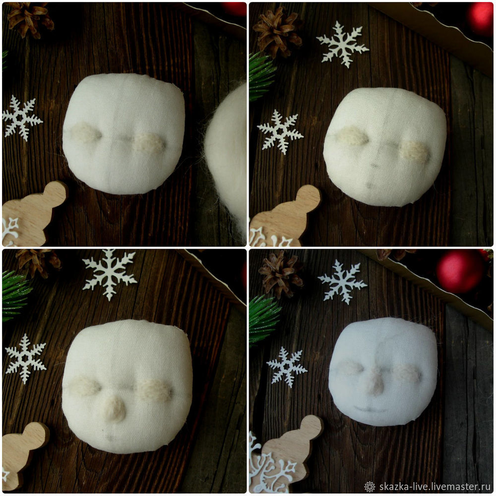На месте точки носа приваливаем капельку из шерсти, слегка сужая ее к глазам. Приваливать нужно тщательно, чтобы капелька была очень плотной. Линию рта рисуем точнее, не выходя уголками за границы зрачков будущих глазок.