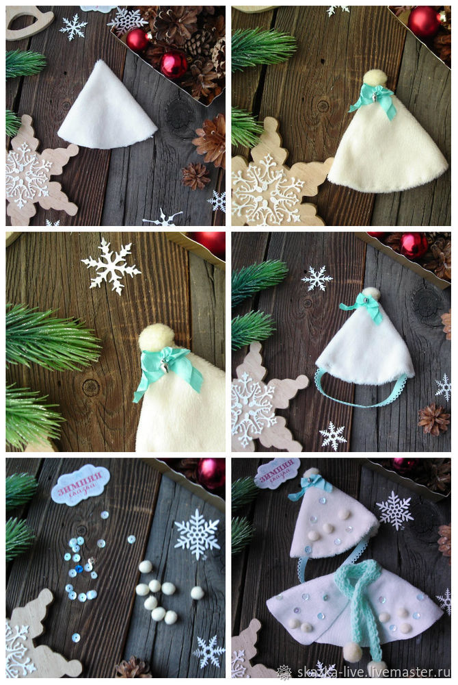 Из плюша с более толстым ворсом шьем колпачок, край колпачка подворачиваем и пришиваем мятной ниточкой, украшаем шебби-лентой, помпончиком и серебряным бубенчиком, пришиваем резинку для того, чтобы колпачок хорошо держался.