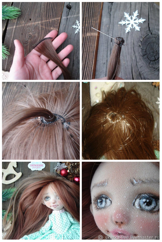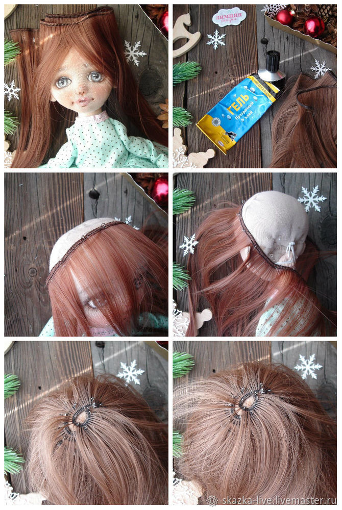 Волосы, кукольные трессы — будем приклеивать при помощи клея Момент-гель. Приклеиваем по спирали, закрепляя при помощи булавок, приклеиваем каждый ряд как можно ближе к предыдущему ряду, на эту малышку у меня ушло почти 2 тресса по 1 метру.