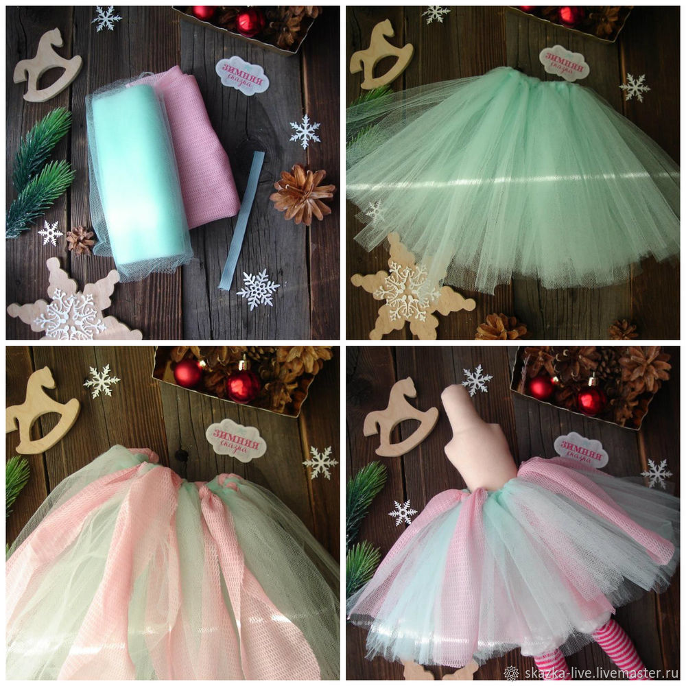 Делаем нижнюю юбку. Это будет обычная туту-юбочка. Для этого мятный фатин нарезаем полосками 15 см на 30см (20-25 штук), а розовую сетку 5 см на 30 см (7-10 штук). И эти полоски завязываем на резинку, которую отмеряем по обхвату талии куколки. Примеряем юбочку на куколку.