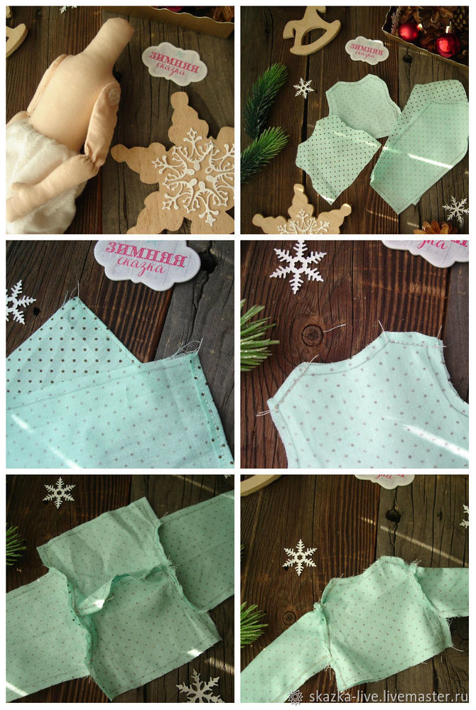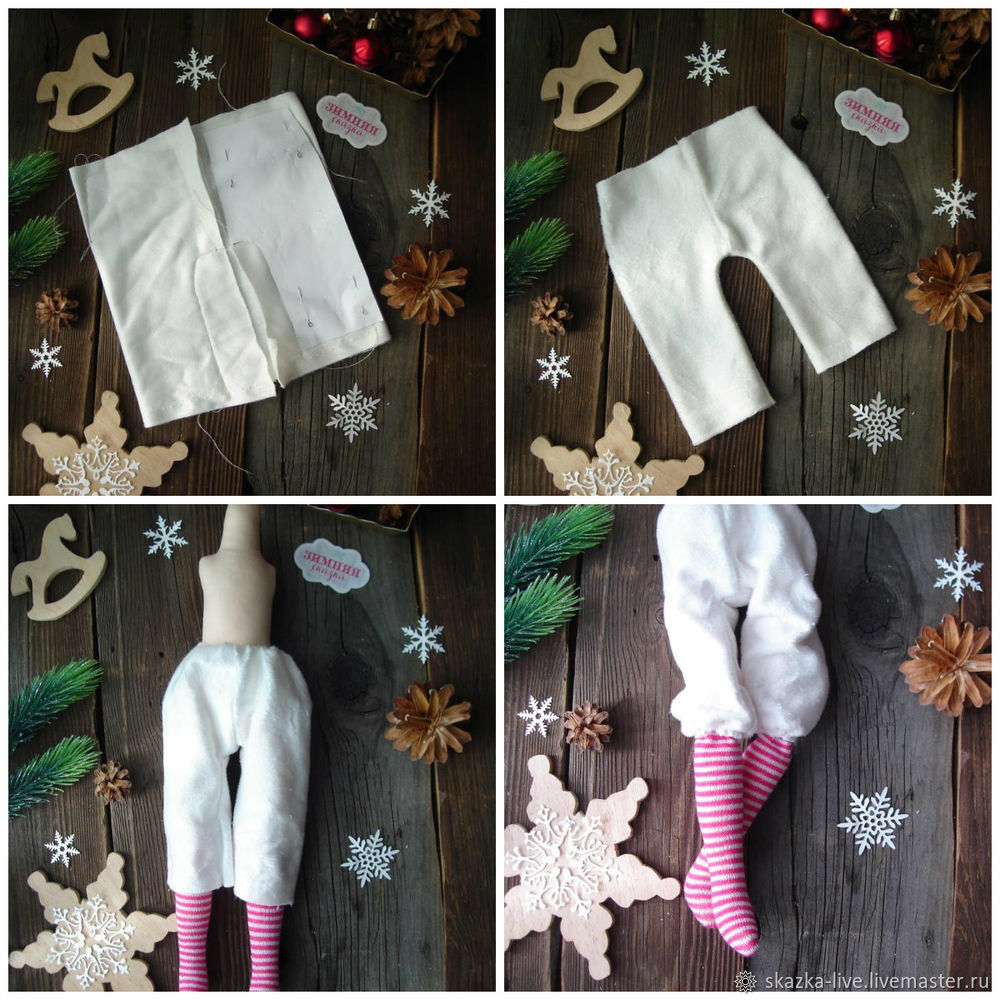 Надеваем штанишки на куклу, поворачиваем верхний край, стягиваем и пришиваем к телу потайным швом. Нижние края так же подворачиваем, стягиваем и пришиваем парой стежков чуть ниже места, где стянута ножка.