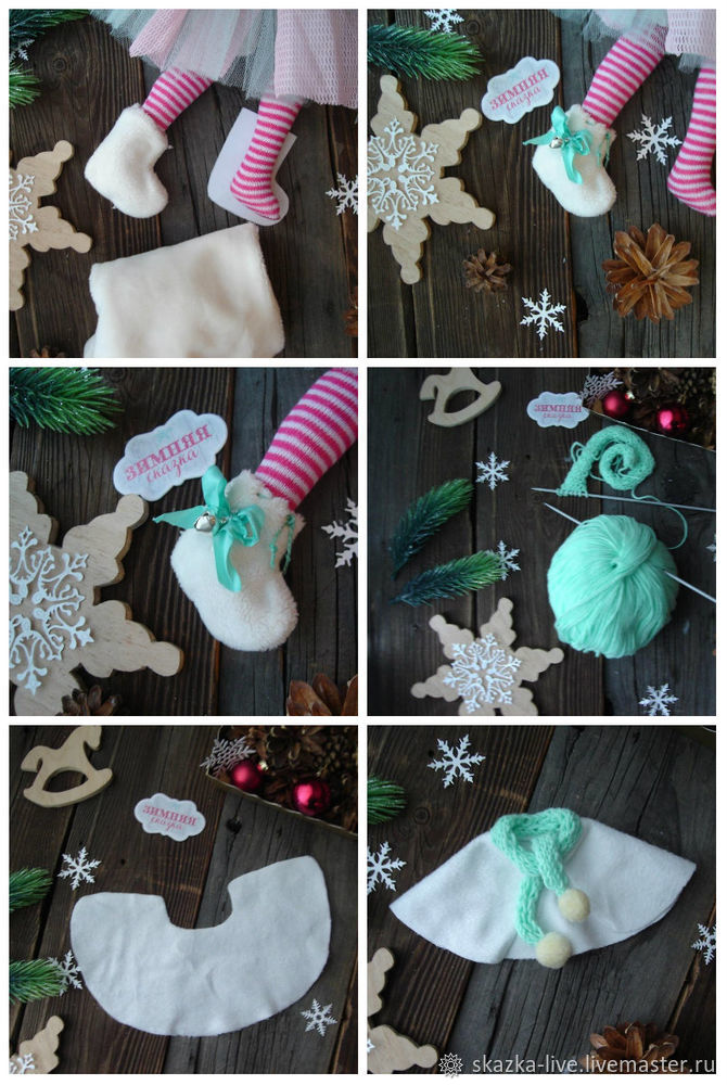 На ножки шьем валеночки, из белого плюша с более толстым ворсом. Верхний край валеночек подворачиваем, прошиваем толстой ниткой, формируя завязочки. По боковинкам пришиваем бантики из шебби-ленточек и серебряные бубенчики.