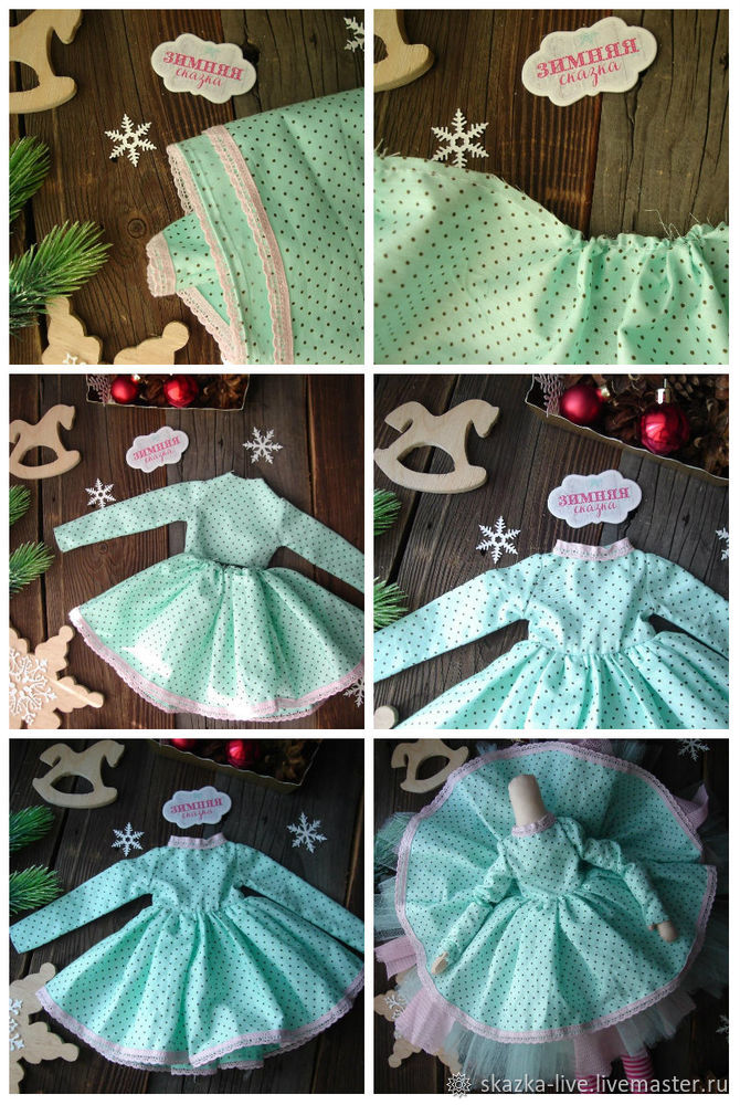 Соединяем верхнюю и нижнюю часть юбки, край горловины подворачиваем и пришиваем кружево, это я делала на руках. Надеваем платье на куклу. Такой вариант шитья платья подойдет именно для несъемных платье.